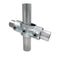 Raccord JM156-D48 en croix 2 entrées avec angle variable de 0° à 11° permettant de relier 2 tubes horizontaux à 1 tube vertical. Souvent utilisé pour fabriquer une serre à potager, les tubes intermédiaires d'un rail, garde-corps ou pour des constructions de structures d'exposition.