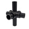 JM176-A27-BK connettore a croce con 3 ingressi che consente di collegare 4 tubi, di cui 1 tubo verticale che scorre lungo il connettore. Il raccordo ha ricevuto un trattamento di cataforesi per ottenere il colore nero opaco. Spesso utilizzato nella realizzazione di aree gioco e rifugi.